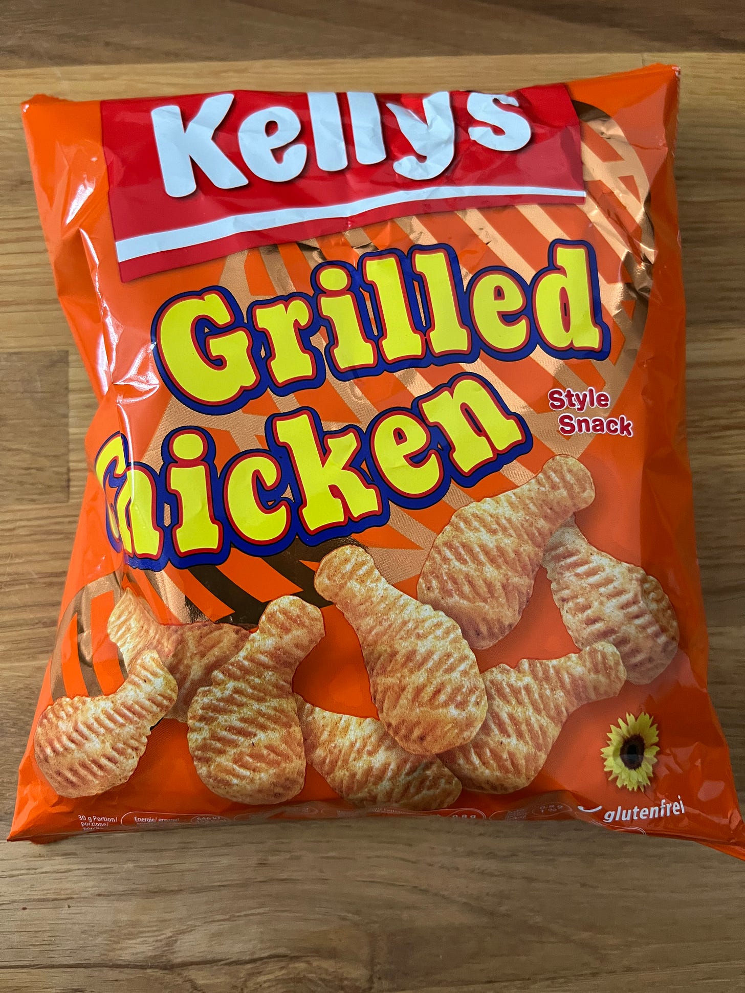 The name is worrisome. I don’t know if “grilled chicken style snack” sounds more natural in German than in English, but I have absolutely no idea what “grilled chicken style snack” means. Is it supposed to taste like grilled chicken? Is it made with residue of grilled chicken? Is it barbecue? Or seasoned any number of different ways grilled chicken might be?